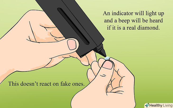 Попросіть провести комбінаційний тест на відмінність між діамантом і муссанітом. у багатьох ювелірів є спеціальний пристрій, за допомогою якого вони розрізняють діаманти і муссаніти. Крім того,вони можуть швидко визначити, чи це діамант або підробка. [5]- Звичайним температурним тестом не можна визначити де діамант, а де муссаніт. Переконайтеся, що при тестуванні визначається електрична провідність, а не теплова.