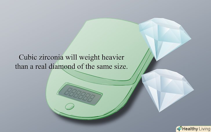 Зважте діамант на високоточних вагах. вага діаманта може дуже відрізнятися від ваги фіаніту (фіаніт важить приблизно на 55% більше, ніж діамант при однакових формах і розмірах каменів). [7] при необхідності, порівняння каменів можливо провести дуже чутливим приладом, здатним вимірювати Камені розміром в карат або як піщинка.- Єдиний спосіб правильно провести перевірку, це знати, що справжній діамант приблизно такого ж розміру і форми. При відсутності діаманта, який можна використовувати для порівняння, важко буде визначитися зі справжністю по вазі.