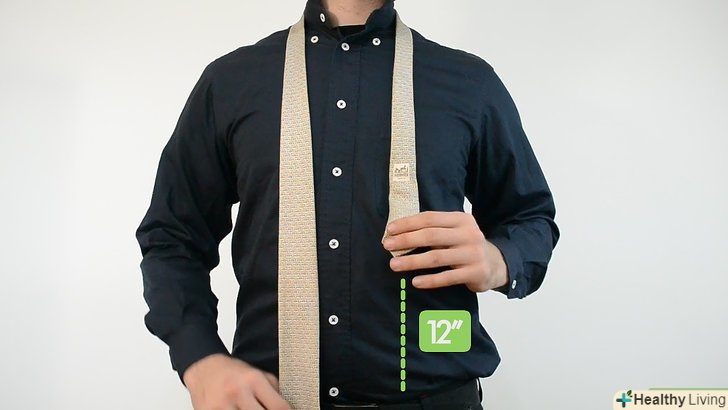 Накиньте краватку навколо шиї таким чином, щоб його широкий кінець виявився праворуч. розмістіть його так, щоб широка частина була приблизно в три рази довше вузької.- На цьому етапі ви можете поекспериментувати, щоб досягти потрібної вам довжини обох частин краватки. Деякі вважають за краще, щоб широка частина була приблизно на 30 см довше, ніж вузька.