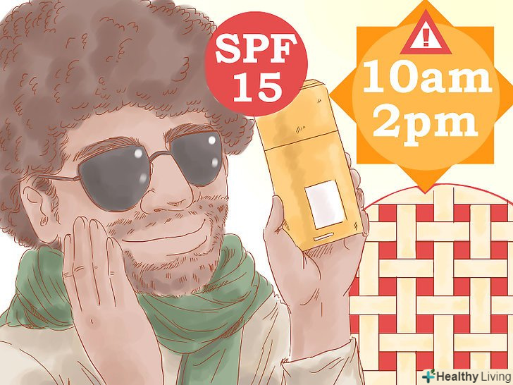 Захищайте шкіру від сонця. сонце здатне завдати істотної шкоди шкірі, включаючи опіки і підвищену чутливість. При постійному впливі сонця шкіра завчасно покривається зморшками, віковими пігментними плямами, а ризик розвитку раку зростає. Щоб шкіра довше виглядала добре, її потрібно постійно захищати від шкідливого впливу ультрафіолетових променів. [18]- Використовуйте сонцезахисний засіб широкого спектру. Важливо користуватися засобом зі значенням SPF не менше 15 і наносити його на шкіру заново як мінімум кожні 2 години.