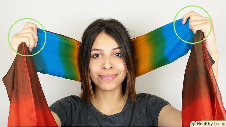 Складіть тканину навпіл і притисніть її до задньої частини голови, утримуючи Краю перед вухами. спочатку складіть тканину так, щоб її ширина склала 15 сантиметрів. Потім охопіть їй голову, перекиньте вперед кінці. У вас повинно бути не менше 1,5-2 метрів тканини.- Можна злегка нахилити голову вперед - так буде зручніше охопити тканиною голову.