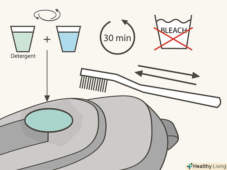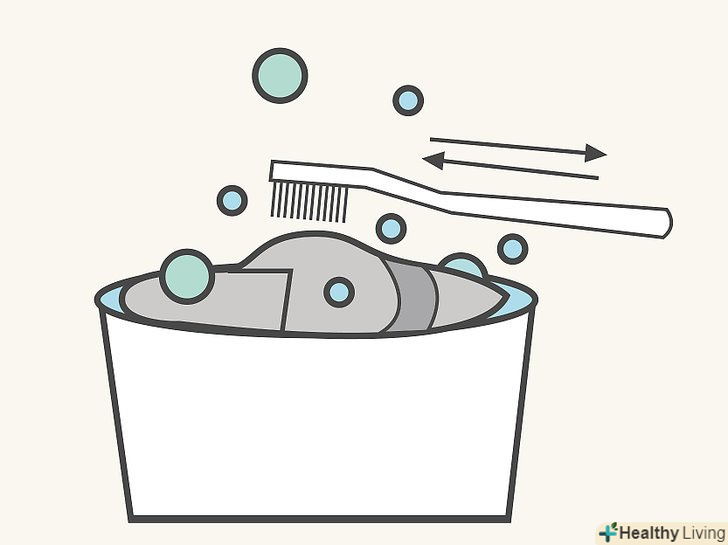 Попередня обробка плям. особливо брудні ділянки слід обробити засобом для виведення плям, але не використовуйте відбілювач. Обробіть плями м'якою щіткою (стара зубна щітка) і залиште засіб на півгодини. Так ви зможете видалити практично будь-які плями під час основного прання.- Якщо у вас немає засобу для попередньої обробки, то нанесіть розчин, який складається з рідкого миючого засобу і води в пропорції 50:50, використовуючи стару зубну щітку.