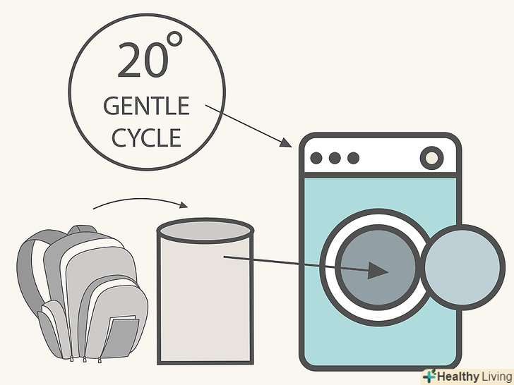 Виперіть рюкзак. покладіть рюкзак в стару наволочку або спеціальний мішок для прання і помістіть його в пральну машину. Засипте невелику кількість (1-2 столові ложки) м'якого порошку. Рюкзак слід прати в холодній або теплій воді, вибравши програму делікатного прання. [7] після завершення програми прання дістаньте рюкзак з наволочки/мішка і витріть зовнішні і внутрішні відділи.- Наволочка запобігає взаємодії ременів і застібок з барабаном машини, щоб захистити барабан і сам рюкзак від пошкоджень. [8] також можна вивернути рюкзак назовні.