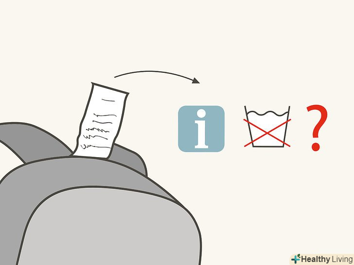 Прочитайте інформацію на ярлику. майже у всіх рюкзаках є ярлик з вказівками по догляду. Як правило, на них вказані рекомендації з прання і сушіння рюкзака, щоб процес очищення не погіршував стійкості до зовнішніх впливів – наприклад, вологостійкість. Ярлик зазвичай знаходиться всередині рюкзака, на бічному шві в найбільшому відділенні.- Агресивні хімічні засоби і грубі способи прання можуть пошкодити рюкзак або його водовідштовхувальну здатність, тому завжди дотримуйтесь інструкції по догляду. При наявності сумнівів використовуйте м'які чистячі засоби і програму для делікатного прання, або ж періть рюкзак вручну.