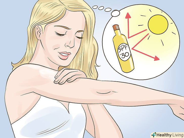 Захищайте шкіру перед виходом на вулицю. шкідливе випромінювання може завдати шкоди шкірі з плином часу, тому замість того, щоб засмагати, слід захищати її. Перед виходом на вулицю наносите сонцезахисний крем (SPF 30 або вище). Крім того, намагайтеся не виходити на сонце між 10:00 і 16:00. Можна також прикривати шкіру за допомогою одягу з довгими рукавами і ховатися під тінню парасольки. [13]