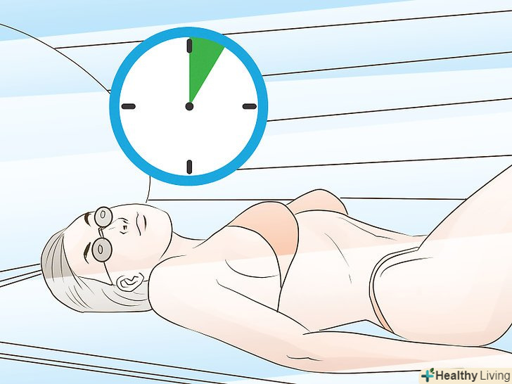 Починайте поступово. при такому методі засмаги краще проводити короткі сеанси, особливо в перший раз. Якщо ви пробудете в солярії занадто довго, ви можете обгоріти. Крім того, короткі сеанси дадуть кращий ефект в довгостроковій перспективі. Так засмага буде лягати шарами поступово, і ви не обгоріть. [2]- Пам'ятайте: жоден відрізок часу не можна вважати безпечним для засмаги. Поступовий початок, можливо, знизить ваші шанси обгоріти, проте руйнівні наслідки від засмаги нікуди не дінуться.