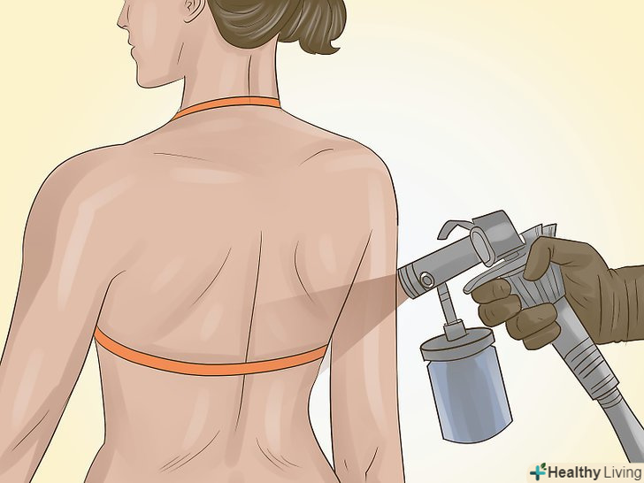 Спробуйте використовувати професійний спрей для автозасмаги. Один з варіантів отримання безпечної засмаги — це звернутися до фахівця, який розпорошить спеціальний засіб на ваше тіло. Бонусом в даному випадку є те, що фахівець зможе розпорошити спрей більш рівномірно, ніж це зробите ви самі в домашніх умовах. [6]- Будьте обережні: не вдихайте спрей і стежте, щоб він не потрапив в очі.