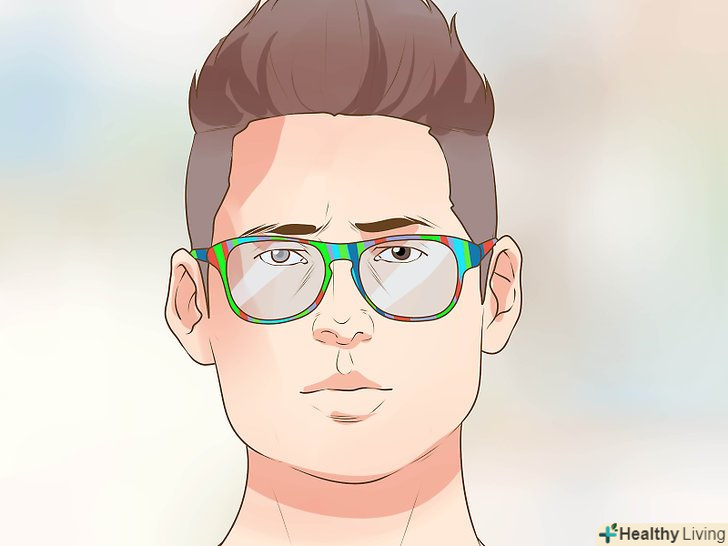 Виберіть колір. Чорний, коричневий і металік — це класичні кольори окулярів, але оправи бувають і яскравих кольорів. Яскравий колір виділить вас з натовпу, і ви будете виглядати цікавіше. [6]- Людям з теплим відтінком шкіри підійдуть коричневі і яскраві відтінки, а людям з холодним відтінком шкіри — синій, сріблястий і все приглушені відтінки.