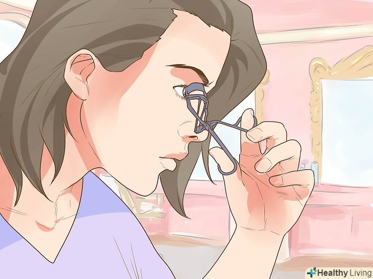 Завивайте вії наверх, а не назовні. намагайтеся завивати вії так, щоб вони розташовувалися паралельно стеклам. Спочатку стисніть підставу вій щипцями для завивки і потримайте кілька секунд. Потім завийте залишилася довжину невеликими ділянками. Це дозволить розкрити очі і зробити їх візуально більше.- Завдяки завивці туш не буде тертися об скла і бруднити їх. [8]