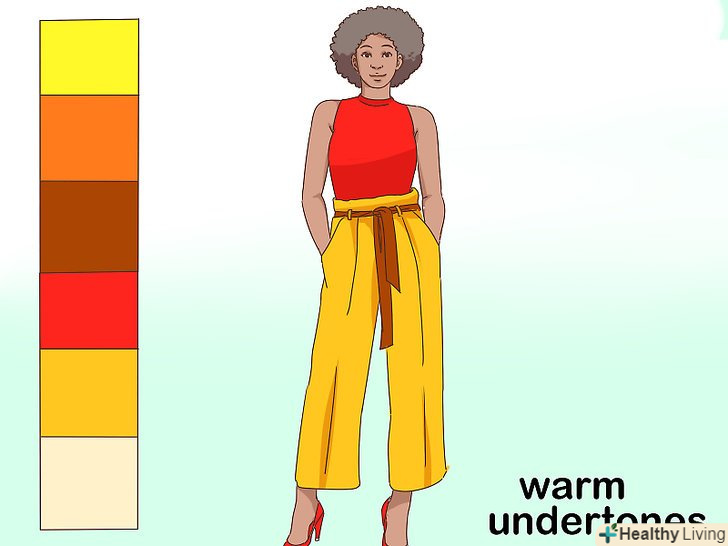 Вибирайте одяг природних і глибоких кольорів, якщо у вас теплий тон шкіри. Людям з теплим тоном шкіри краще одягатися в нейтральні кольори, такі як бежевий, кремовий, оранжево-кораловий, гірчичний, молочний, Жовтий, Помаранчевий, Коричневий, теплий червоний і жовто-зелений. [43] .- При цьому не завадить включати в свій образ золоті і бронзові тони, особливо при виборі біжутерії.