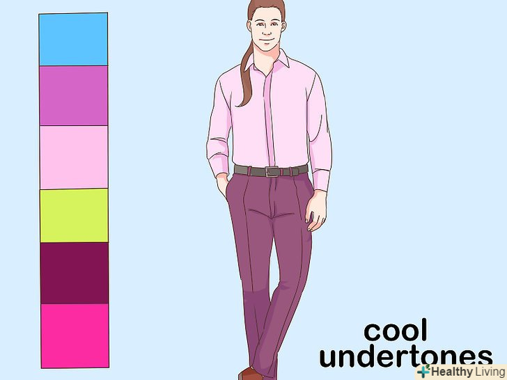 Для холодного тону шкіри зупиніть свій вибір на одязі синіх і блідих відтінків. Людям з холодним тоном шкіри краще носити синьо-червоні, сині, фіолетові, рожеві, зелені, сливові, сині, пурпурні і синьо-зелені тони в одязі. [44]- Включайте в одяг сріблясті елементи і використовуйте срібну біжутерію.
