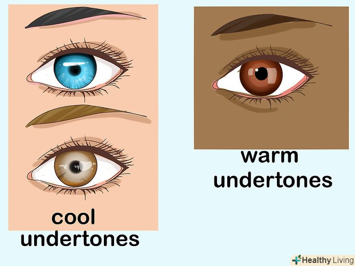 Зверніть увагу на колір своїх очей. колір очей може служити підказкою до визначення тону шкіри. Більш світлі очі (наприклад, блакитні або блідо-коричневі) зазвичай говорять про холодному тоні шкіри, тоді як наявність золотистих прожилок на райдужці зазвичай характерно для людей з теплим тоном шкіри.- Наприклад, блідо-блакитні очі частіше супроводжують холодного тону шкіри, а медово-карі — теплому.