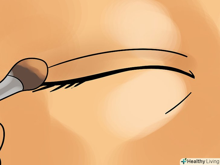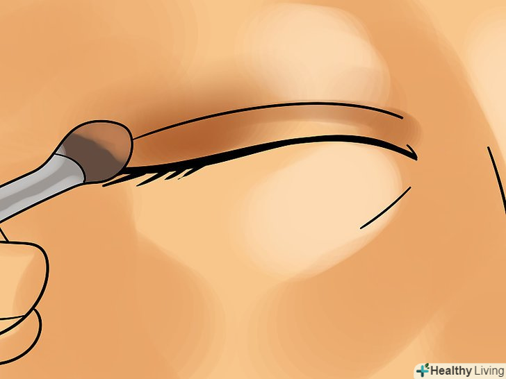 Почніть з косметичного засобу для маскування дефектів шкіри. нанесіть світлий природний тон на верхню частину надбрівної дуги. Нанесіть тіні середнього відтінку на повіки над стрічкою або складкою. Слід змішати кольори разом. Постарайтеся розтушувати перехід між середнім і світлим відтінками, наносячи середній тон трохи зовні і заповнюючи 2/3 століття. [19]