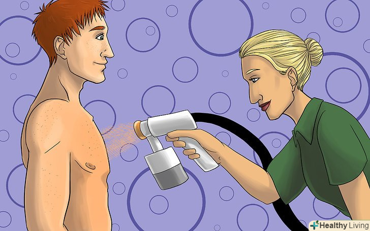 Зробіть це самі. Є багато продуктів різних брендів, які подарують Вам гладкий, рівний загар.- Відповідно до інструкцій нанесіть лосьйон або спрей рівномірно, намагаючись покрити всю шкіру. Найкращим варіантом буде лосьйон, що не викликає утворення комедонов, тобто той, який не буде забивати пори.