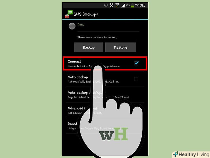 Підключіть акаунт Gmail (SMS Backup+).якщо ви хочете скористатися додатком Backup+, підключіть обліковий запис Gmail, щоб скопіювати в неї SMS-повідомлення. Для цього в головному меню програми натисніть "Підключити". Система запропонує увійти в ваш обліковий запис Google.- Для роботи з додатком Backup+ у Вашому Gmail-акаунті активуйте Поштовий протокол IMAP. Для цього відкрийте Вашу поштову скриньку Gmail і натисніть "Налаштування» – «пересилання і POP/IMAP» - "включити IMAP".[2]