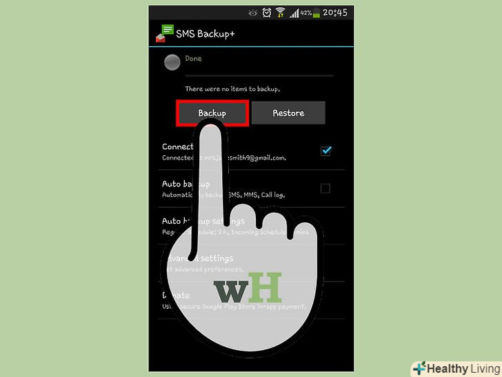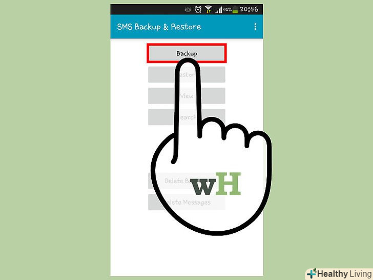 Запустіть процес резервного копіювання.налаштувавши додаток, перейдіть до резервного копіювання. Процес залежить від обраного Вами програми.- При використанні програми SMS Backup + натисніть «Резервне копіювання» і дочекайтеся, поки завершиться копіювання SMS-повідомлень в ваш GMail-аккаунт. На це піде деякий час (в залежності від кількості копійованих повідомлень). Якщо ви запускаєте цей процес в перший раз, додаток запитає вас, чи скопіювати всі повідомлення, які зберігаються на пристрої. MMS-повідомлення копіюються за замовчуванням.