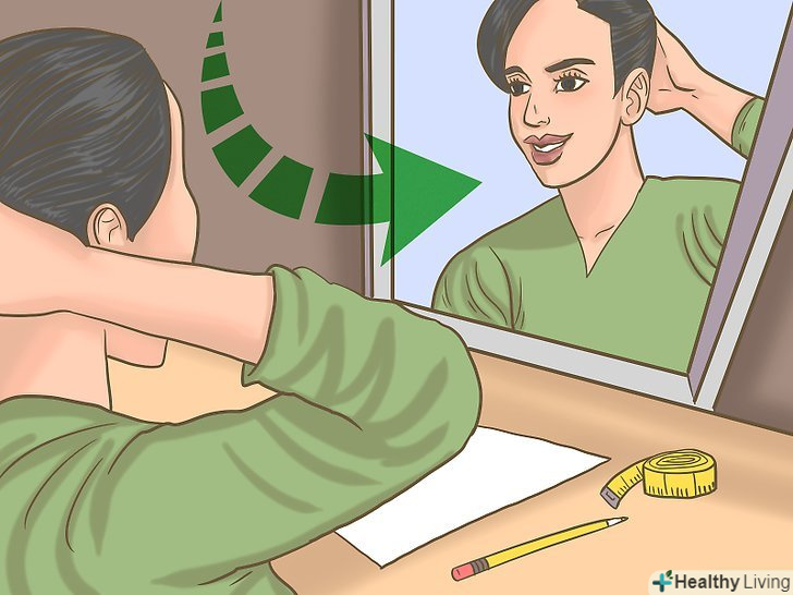 Розташуйтеся перед дзеркалом. найлегше знімати мірки, коли ви бачите те, що робите. Встаньте або сядьте перед великим дзеркалом у добре освітленій кімнаті. Погляньте прямо в дзеркало, не задираючи і не опускаючи при цьому підборіддя. [3]