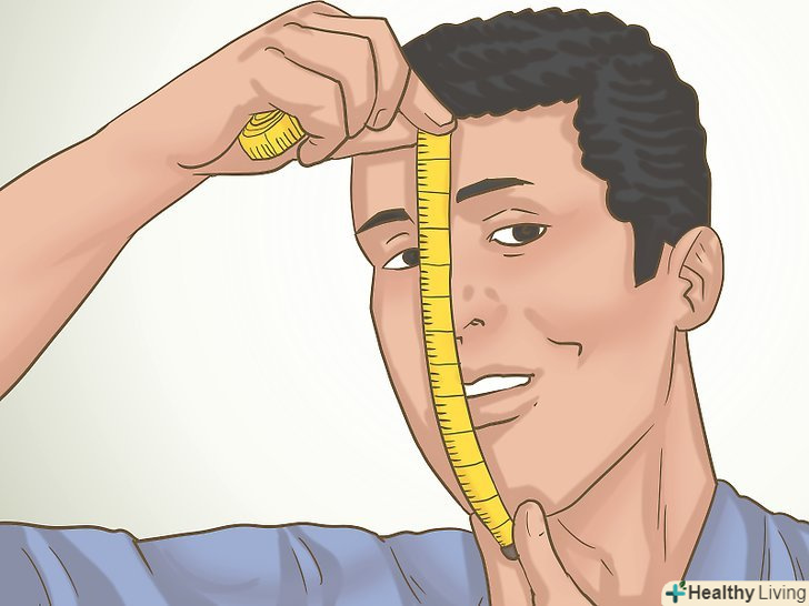 Виміряйте висоту обличчя. Візьміть сантиметрову стрічку і виміряйте відстань від центральної точки лінії росту волосся вгорі до кінчика підборіддя. Якщо з віком ваша лінія росту волосся почала підніматися або ви взагалі ходите з голеною головою, приблизно оціните, де насправді повинна розташовуватися ця лінія. [7]На замітку: якщо у вас великий ніс, то він може істотно спотворити дану мірку. Чи не притискайте сантиметрову стрічку до обличчя, а натягніть її вертикально перед обличчям і візуально оціните по ній відстань від лінії росту волосся до підборіддя.