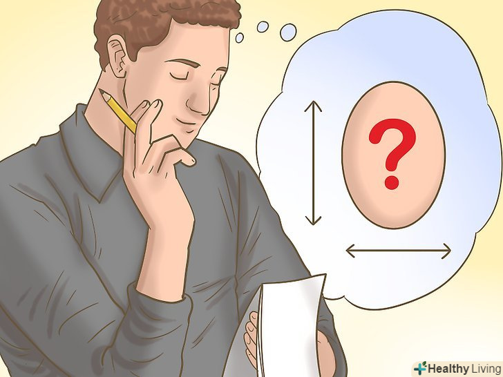 Зіставте всі мірки між собою, щоб визначити форму свого обличчя. після того як ви зняли всі необхідні мірки і записали їх, визначте, які з них найменші, а які — найбільші. Зіставте пропорції свого обличчя з пропорціями основних зустрічаються форм. [8]- Наприклад, якщо ваше обличчя приблизно однакової висоти і ширини, ймовірно, воно кругле або квадратне. У квадратного особи буде дещо ширша і незграбна лінія щелепи, ніж у круглого особи.