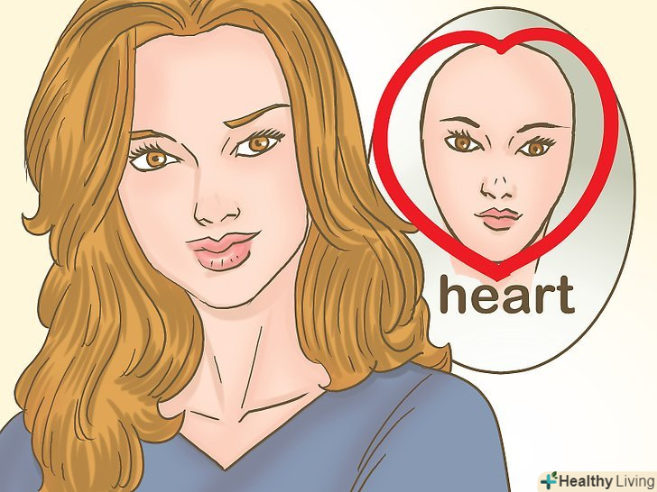 Дізнайтеся серцеподібну форму обличчя по широкому лобі і вузькому підборіддю. у серцеподібного особи найширше місце — це лоб, при цьому обриси обличчя поступово звужуються від чола до вузького підборіддя. Іншими словами, в цьому випадку лоб ширше скул, а підборіддя вже скул і чола. [15]На замітку: найчастіше серцеподібне обличчя асоціюється з гострим підборіддям.