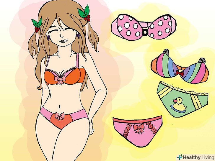 Одягайте симпатичну білизну. все з метеликами, сонечками, дрібними птахами, кошенятами, цуценятами і т.д. просто ідеально підходить для вашої нижньої білизни. Зображення, візерунки, ляльки, обличчя та слогани – все виглядає мило на білизні. Крім того не забувайте про тканини в горошок, збірках і маленьких бантиках.- З'єднайте це все з симпатичною сумочкою. дістаньте шикарну сумку (так багато наіпрелестнейших варіантів!) і помістіть туди маленьку собачку при наявності можливості. Вийде дуже мило! Якщо ви не бажаєте носити з собою невелику собаку, навіть якщо маєте одну таку у Вашому житті, придбайте сумку із зображенням домашньої тварини, або чогось в рівній мірі чарівного, красується прямо на її поверхні.