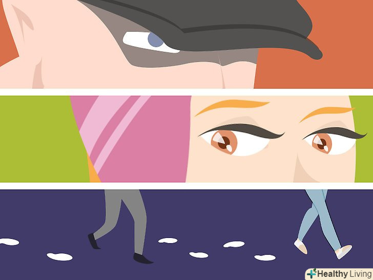 Завжди будьте насторожі. Якщо ви гуляєте, бігаєте або вигулюєте собаку на самоті, завжди будьте пильні і дивіться по сторонах. Обізнаність про присутність сторонніх стане першим рівнем захисту.- Час від часу озирайтеся назад і по сторонах. Оптимальний інтервал становить від 30 до 60 секунд. Щось привернуло вашу увагу або викликало занепокоєння? Люди можуть не тільки інтуїтивно відчувати, що за ними спостерігають, але також помічати дивні обставини або поведінку інших, включаючи незвичайну увагу до себе.