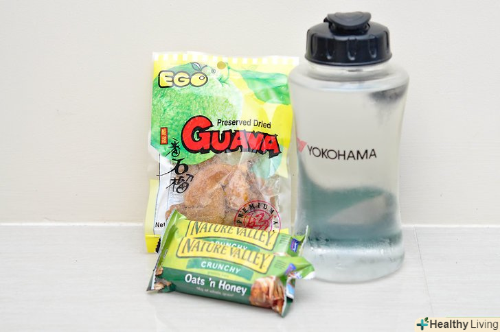 Упакуйте достатню кількість води та їжі. Воду важко носити, але вам потрібно, щоб вона була в достатній кількості. Також вам знадобляться висококалорійні закуски. Покладіть, принаймні, одну запечатану пляшку води в сумку і додайте ще, якщо можете витримати цю вагу. Переконайтеся, що контейнер міцний, багаторазовий і він легко відкривається і закривається.- Упакуйте вівсяні батончики з родзинками, С.О. С. батончики, або протеїнові батончики, які містять багато калорій і вуглеводів і можуть зберігатися довгий час. Їжа потрібна не тільки для енергії, вона важливі і для морального настрою. Також відмінним варіантом послужать сухофрукти.