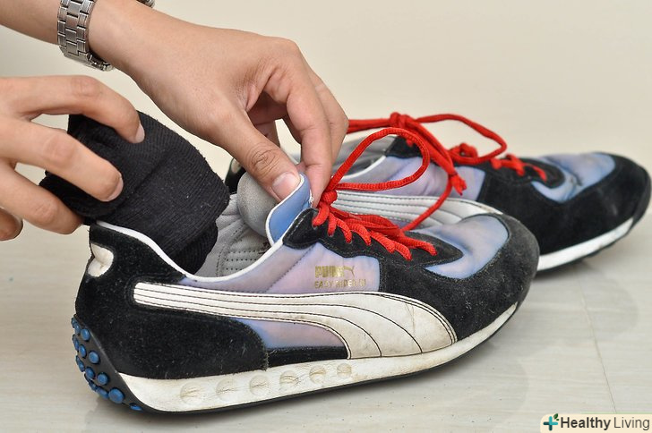 Упакуйте шкарпетки. Упакуйте пару спортивних бавовняних шкарпеток, які підійдуть для вашого спортивного взуття по товщині. Уникайте укорочених шкарпеток, вони не захистять ваші п'яти при ходьбі на довгі дистанції. Засуньте їх у взуття, щоб заощадити місце і зберігати їх разом з взуттям.- Жінки, які носять спідниці та сукні можуть виграти, якщо упакують високі спортивні шкарпетки до коліна – гольфи, щоб захистити ноги якомога більше.
