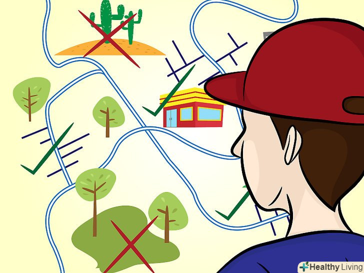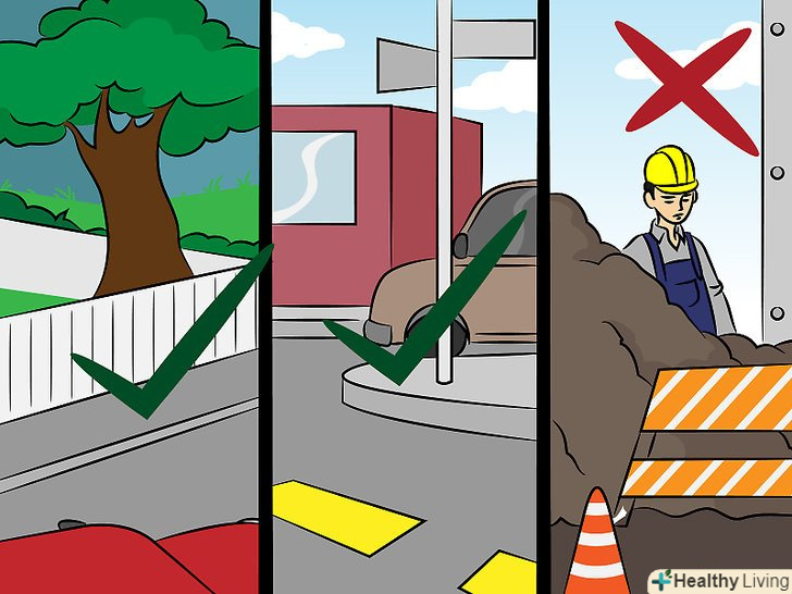 Знайдіть безпечний шлях для пішоходів. [9] безпечний шлях означає, що на всьому його протязі є Тротуари. Також звідти повинні повністю проглядатися перехрестя, тобто ви повинні бачити всі машини, що під'їжджають до вас. Також на вашому шляху не повинно бути небезпечних зон, наприклад, будівництв. В ідеалі, всі ключові перехрестя повинні бути регульовані.- Вибирайте ті дороги, які менш завантажені і на яких діють великі обмеження швидкості.