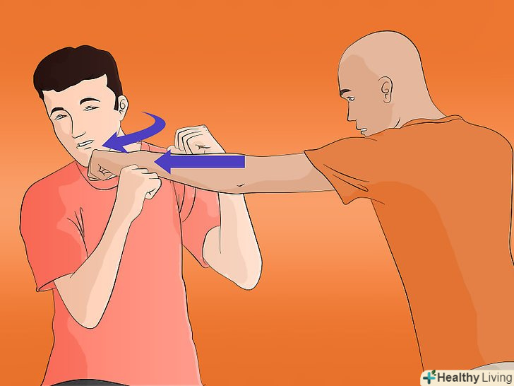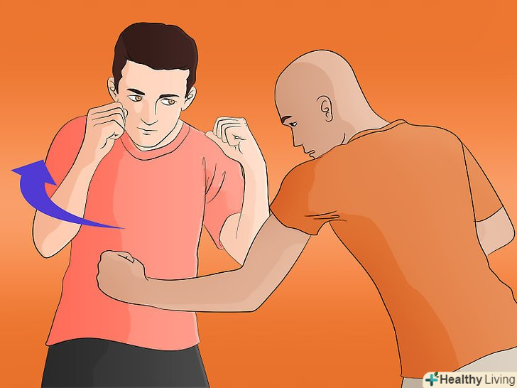 Скрутіть з ударом. Якщо ви не можете уникнути удару, рухайтеся по траєкторії удару. Зрушення вашого тіла в бік точки удару дозволить уникнути удару в її середину. Це збільшує час впливу, який змінює імпульс удару і знижує його силу.- Ви також можете нахилитися, або злегка переміститися в напрямку противника. [3] це допомагає зменшити силу удару або глушить його повністю. Якщо вам вдасться вивести вашого супротивника з рівноваги, це створить ефект нокдауну і дасть вам час втекти.