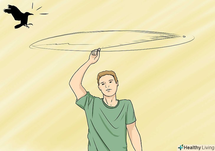 Прив'яжіть сталеву гайку до кінця мотузки. Крутите її над своєю головою. Ви будете виглядати як вертоліт, але Сороці не захочеться брати участь в цьому процесі!- Будьте непередбачувані. Сороки можуть чекати вас, якщо ви з'являєтеся регулярно. Будьте не постійні і не слідуйте розкладом. Таким чином, менш імовірно, що сороки будуть готові напасти на вас.