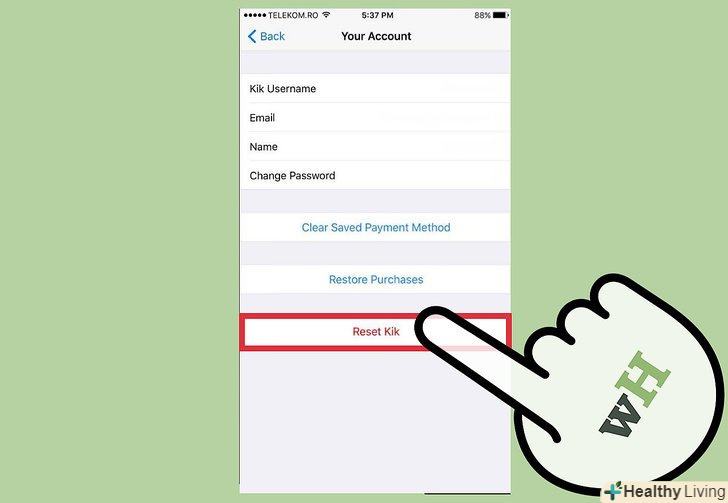 Прокрутіть вниз і торкніться"Reset Kik." (перезапустити Kik). Після цього вам потрібно буде підтвердити цю дію.- Перезапуск Kik призведе до виходу з програми і видалення всіх повідомлень, але список друзів при цьому збережеться.