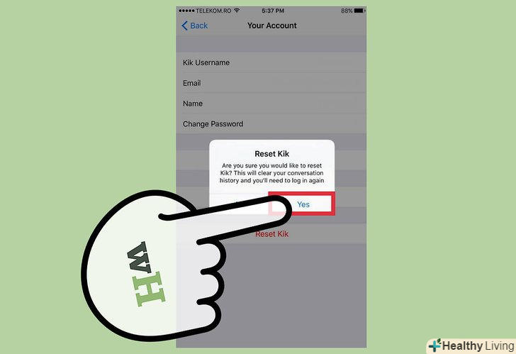 Підтвердіть бажання перезапустити додаток.ви вийдете з програми і опинитеся на екрані входу. Щоб почати знову користуватися додатком, вам доведеться в нього увійти.- Якщо ви забули пароль, скиньте його, пройшовши за адресоюws.kik.com/p і ввівши свою адресу електронної пошти. Перейдіть за посиланням в отриманому повідомленні, щоб створити новий пароль. Якщо у вас більше немає доступу до адреси електронної пошти, який ви прив'язали до аккаунту Kik, то вам не вдасться скинути пароль.
