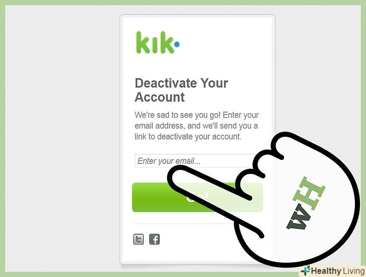Назавжди видаліть обліковий запис у Kik. якщо ви більше не хочете користуватися додатком, видаліть свій аккаунт:- Пройдіть за адресоюws.kik.com/deactivate і введіть адресу електронної пошти, яку Ви прив'язали до облікового запису.