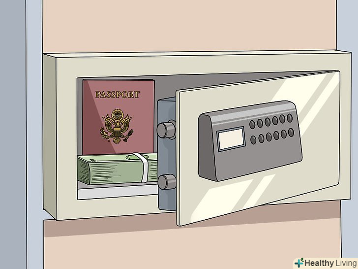 Візьміть з собою те, що вам потрібно, і залиште все інше в сейфі готелю. у багатьох готелях є сейфи, в яких гості можуть зберігати цінні речі, якщо їх немає в номері або якщо в номері прибирання. Перш ніж піти, складіть паспорт, Ключі, зайві готівку і дорогі прикраси в сейф і закрийте його. Якщо у вас вкрадуть сумку, ви втратите тільки частину своїх коштів. [10]- Завжди залишайте трохи грошей у сейфі готелю. Якщо вас обкрадає кишеньковий злодій, у вас будуть гроші, щоб повернутися додому і поїсти, поки ви вирішуєте проблему.