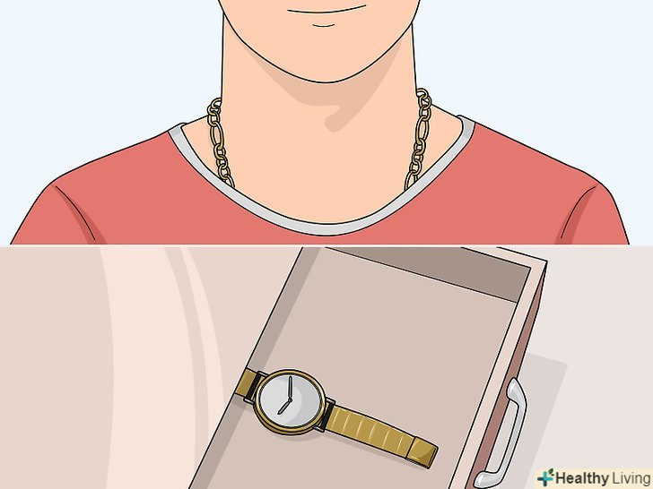Сховайте ланцюжок під одяг і залиште годинник в готелі. якщо ви носите прикраси, ховайте ланцюжки під одяг, щоб їх не зірвали у вас з шиї. Не надягайте годинник, якщо вони дорогі. Не надягайте прикраси з камінням, як дорогоцінними, так і ні. [12]- Кільця можна залишити, якщо тільки вони не бовтаються у вас на пальцях. Кільця дуже складно зняти непомітно. Але намагайтеся не носити кільця з дорогоцінними каменями. Якщо на вас буде багато каменів, кишеньковий злодій може вирішити, що у вас при собі багато грошей.