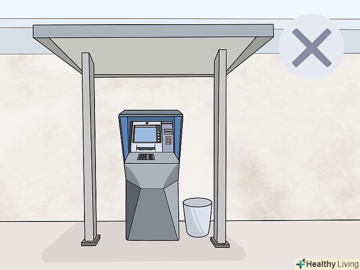 Не користуйтеся банкоматами в небезпечних місцях. банкомати притягують кишенькових злодіїв. Деякі злодії працюють в парі: один відволікає, а другий краде гроші, поки людина не бачить. Деякі злодії заглядають через плече, підглядають пін-код і крадуть гаманець. Якщо вам потрібно скористатися банкоматом, зробіть це в безпечному місці (бажано — в надійному приміщенні). [13]- Можна також користуватися банкоматами в малолюдних місцях в ресторанах і готелях.