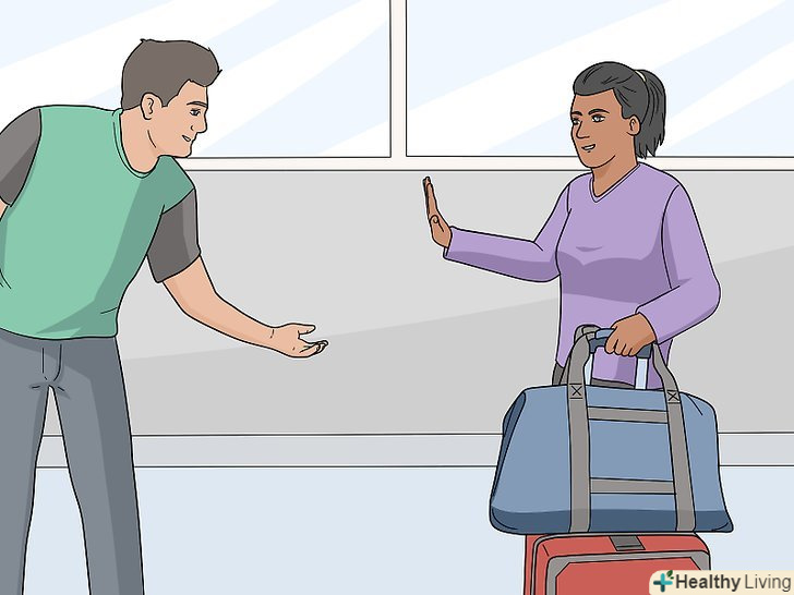 Не дозволяйте незнайомцям допомагати вам нести ваш багаж. якщо ви заходите з валізою в поїзд або дістаєте його з таксі, не приймайте допомогу незнайомців. Навіть якщо багаж важкий, людина може втекти з ним. Деякі люди дійсно щиро хочуть допомогти, проте ризикувати не варто. [19]- Навіть якщо вам доведеться повозитися 5-10 хвилин, намагайтеся донести свій багаж самостійно.