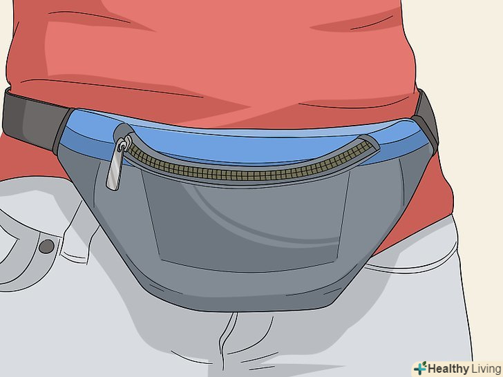 Перекладіть вміст гаманця в поясну сумку. Ручку сумки можна відрізати, через що вихопити сумку з рук буде дуже просто. Поясна сумка з нейлону буде щільно охоплювати талію, і її набагато складніше зрізати або зняти. Перекладіть гаманець, карти і гроші в поясну сумку. Затягніть ремінь на талії і поверніть сумку так, щоб вона опинилася під пупком. Завдяки цьому вам буде простіше доглядати за цінними речами. [9]- Не використовуйте поясну сумку зі звичайною пластиковою пряжкою. Краще купіть сумку із захистом від злодіїв в Інтернеті. У таких сумок більш надійні пряжки, які злодіям складно відкрити.