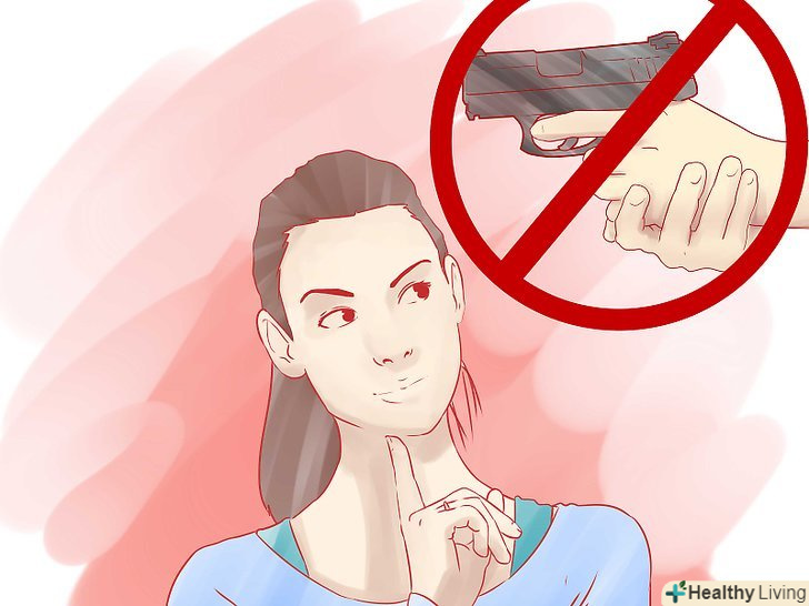 - Якщо вам якимось чином вдалося дістати зброю, майте на увазі, що воно може бути використано проти вас. відмовтеся від зброї, якщо у вас немає досвіду його використання, і відкиньте його якнайдалі. Якщо ви вирішили використовувати пістолет, Схопіть його , як можна швидше і направте на зловмисника. Прокричіть " лягайте на землю і покладіть руки за голову!». Зробіть це голосно і чітко, повторюючи при необхідності. Якщо у вас немає достатньо часу, щоб подумати про все це, або ваш опонент ще з пістолетом, спрямованим на вас, стріляйте на поразку, якщо зможете. Ви можете впоратися з почуттям провини як-небудь іншим разом. Зате ви не втратите своє життя, і краще бути заарештованим, ніж бути мертвим. У багатьох державах допускається використання смертельної сили у відповідь на смертельну грозу, але ви повинні знати закони тієї країни, в якій ви живете..