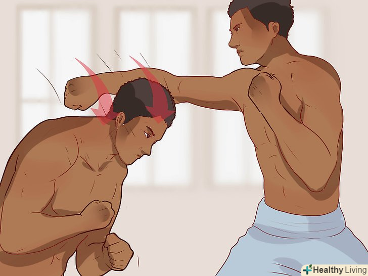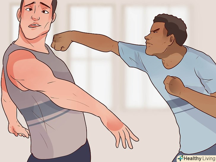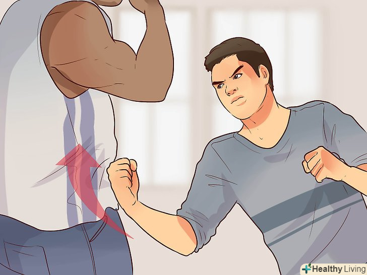 Будьте готові до ударів. навряд чи ви зможете вийти з бійки з більшим противником без єдиної подряпини. Можливо, ви не встигнете вчасно зреагувати і пропустіть кілька ударів. Будьте готові до цього. Пропустити удар погано, але ще гірше бути захопленим зненацька. [6]- Якщо ви все ж пропустите удар, постарайтеся, щоб він припав на плече або лоб — ці місця твердіше і їх важче пошкодити, ніж нижню щелепу і інші ділянки обличчя. Змістіться назад, щоб пом'якшити удар. [7]