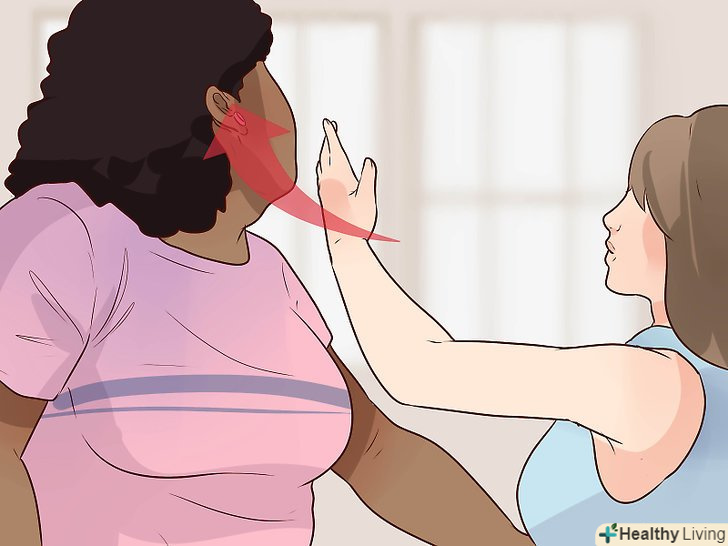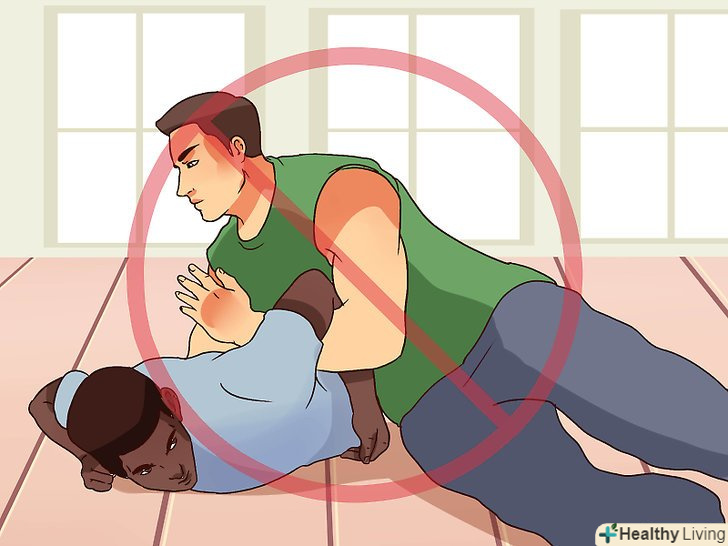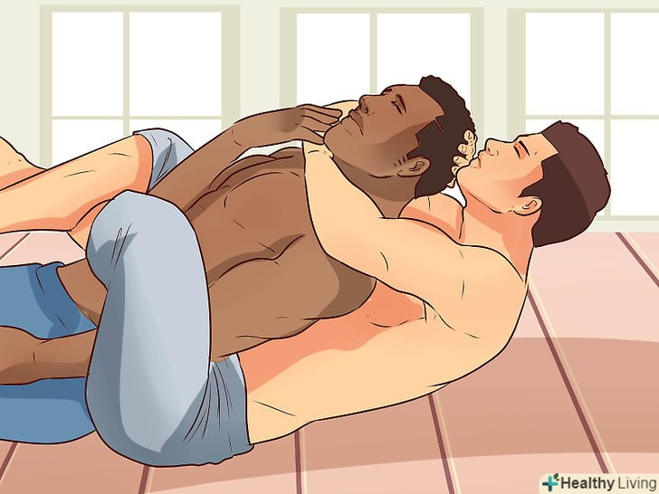 Використовуйте больові прийоми. припустимо, противник все ж повалив вас на землю, і ви не можете піднятися на ноги. В цьому випадку вдамося до больового прийому: затисніть або викрутіть противнику якусь частину тіла, щоб він не зміг продовжувати боротьбу. Візьміть суглоб, викрутіть руку або проведіть задушливий прийом. Таким чином ви заподієте противнику сильний біль і зможете завершити сутичку. Навіть гігант не зможе продовжувати боротьбу, якщо позбавити його свідомості або зламати руку. [16]- Залежно від вашої позиції, обхопіть шию противника ззаду або спереду і проведіть задушливий прийом. Це порушить кровообіг і утруднить дихання, в результаті чого ваш противник втратить свідомість. Достатньо лише на кілька секунд міцно обхопити шию, щоб людина «заснув». [17] [18]