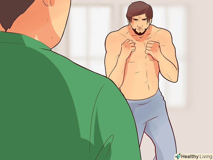 Подбайте про захист. підніміть руки і прикрийте ними свою голову. При цьому передпліччя повинні розташовуватися вертикально і паралельно один одному, так щоб долоні були спрямовані до ваших щік. Злегка стисніть долоні в кулак, щоб бути готовим завдати удару у відповідь. Трохи пригніться і опустіть лікті до середини тіла, щоб захистити ребра і живіт від несподіваного удару. [2]- Не розслабляйтеся і не послаблюйте захист, навіть якщо ви втомилися. Якщо ви опустите руки, противник зможе завдати вам вирішального удару.
