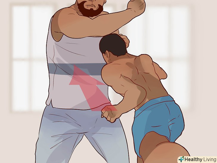 Вимотуйте противника. один з недоліків високого зросту і більшої ваги полягає в тому, що для рухів потрібно більше зусиль, і в результаті більша людина швидше втомлюється. Скористайтеся цією перевагою. Захищайтеся від ударів за допомогою ухилів і пірнань і постійно рухайтеся, поки ваш противник не почне сповільнюватися. Після цього ви зможете скористатися своєю перевагою в швидкості, підібратися до супротивника ближче і нанести йому кілька ударів. [11]- Виконуйте вправи на зміцнення серцево-судинної системи, щоб в разі бійки ви могли довше протриматися і вимотати більшого противника.