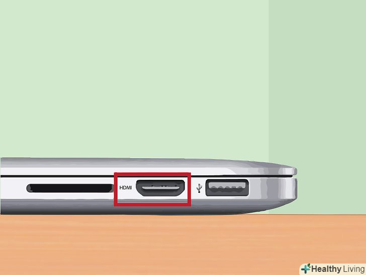 Знайдіть відеороз'єм у вашому Mac.тип відеороз'єму визначить тип кабелю та / або адаптера, який можна використовувати. Є чотири основні типи відеороз'ємів:[2]- HDMI. Цей роз'єм схожий на роз'єм USB, але тільки у нього з боків є виступи. Цей роз'єм позначається літерами "HDMI". Якщо у вас є цей роз'єм, адаптери вам не знадобляться. Більшість комп'ютерів і ноутбуків Mac, випущених після 2012 року, мають цей роз'єм.