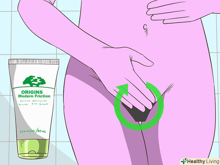 Нанесіть крем або гель для гоління. Будьте обережні і стежте, щоб крем не потрапив у піхву. Не наносьте крем на статеві губи і при необхідності змийте його і нанесіть ще раз. Використовуйте прозорий крем або гель для гоління, щоб ви могли бачити, де саме знаходяться волосся. [4]- В крайньому випадку можна використовувати кондиціонер для волосся, проте не слід робити це регулярно, так як в порівнянні з більшістю кремів для гоління Кондиціонер недостатньо зволожує шкіру.