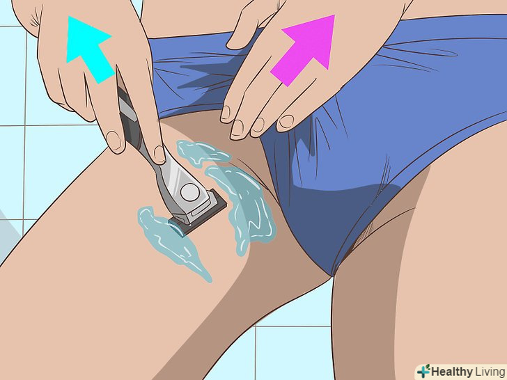 Однією рукою туго натягніть шкіру. при голінні лобкових волосся складність полягає в тому, що в даному місці шкіра досить нерівна. Акуратно відтягніть шкіру своєї неведущей рукою, щоб утворилася більш рівна поверхня, візьміть бритву в провідну руку і приступите до гоління. [7]