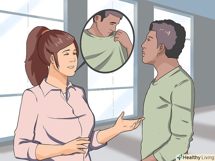 Будьте конкретні, чесні і доброзичливі. [10] тонкі натяки в стилі " Нічого собі, щось погано пахне!"біля вашого друга або випадково залишений дезодорант на його або її столі можуть здобути дію, але найімовірніше залишаться непоміченими. [11] прямо повідомте про назріваючу проблему, але при цьому будьте доброзичливі, не жартуйте і не підбивайте одного.- Іноді достатньо пари слів. Дайте прямо зрозуміти і не ходіть навколо так близько. Говоріть чітко і ясно, щоб ваш друг зрозумів, про що йде мова.