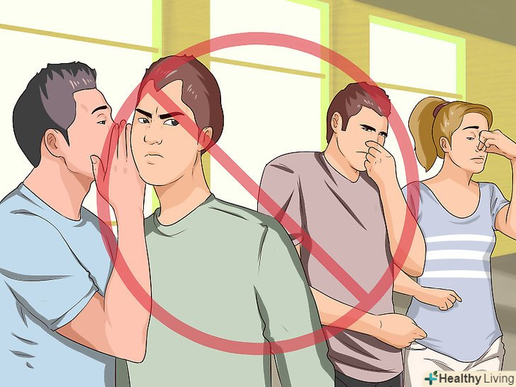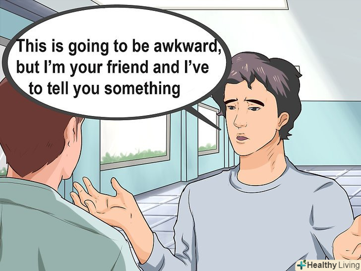 Уникайте незручності. [8] це буде непроста розмова і розтопити лід може бути дуже важко. Спробуйте почати з чогось на зразок "це не дуже приємно, але я твій друг і повинен сказати тобі дещо...". Ставте наголос на те, що ви намагаєтеся допомогти, жодним чином не намагаючись при цьому збентежити його або її. Також варто повідомити, що ви не розповісте про проблему іншим і стримаєте своє слово.