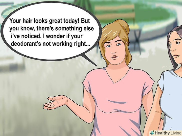 Для початку скажіть що-небудь приємне. [9] ви можете злегка полегшити сприйняття новин, попередньо зробивши комплімент, а потім вже перейти до проблеми запаху тіла.- Спробуйте щось на кшталт " твоє волосся сьогодні виглядає шикарно! Але знаєш, я помітив ще дещо. Мене це дивує, але здається твій дезодорант не дуже хорошої якості..."